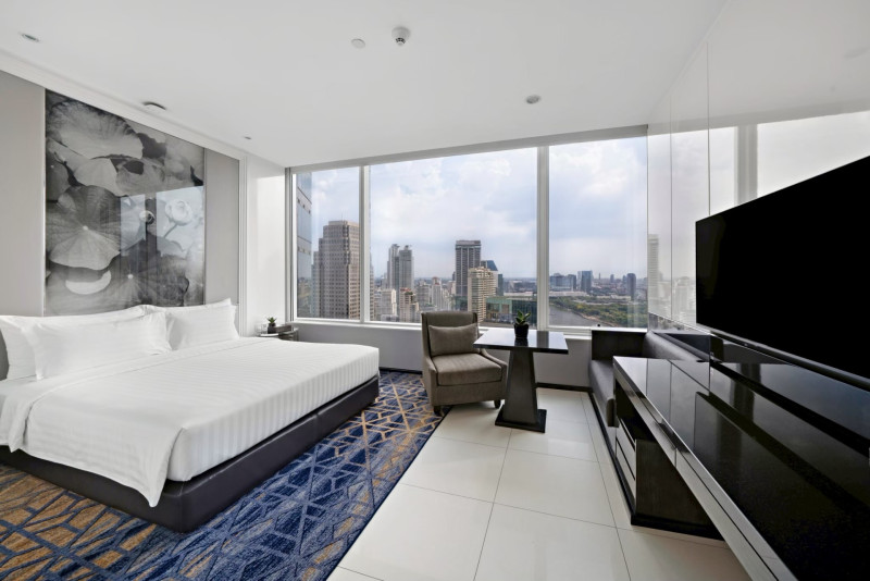 Sofitel Bangkok Sukhumvit brings refined French elegance to an iconic 32-story Art Deco landmark situated in the heart of Bangkok’s vibrant downtown district. Strategically positioned for unparalleled accessibility, the hotel features its own private skywalk bridge providing direct passage to the BTS Asok and MRT Sukhumvit transit hubs, as well as the Terminal 21 shopping complex. With its premier location just eight SkyTrain stations from BITEC, the hotel serves as an incomparable choice for discerning international travelers and business professionals seeking a luxurious stay in the city’s primary commercial center.