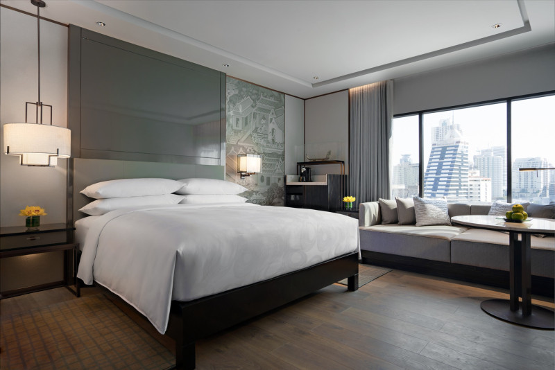 The Sheraton Grande Sukhumvit has 420 beautifully appointed rooms and suites that provide luxurious comforts, sophisticated style, an in-room entertainment system, wireless internet and personal butler service. Accommodation includes 42 Grande Suites, 3 Specialty Suites, and 3 Thai-themed Suites which enjoy view of Lake Ratchada. The standard guest rooms are a generous 45 square meters; one of the most spacious in Bangkok. All rooms benefit from a walk-in closet and an elegant bathroom. Special accommodation for disabled guests is available. Most floors are non-smoking.
